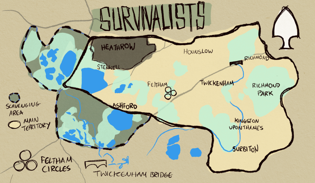 After London falls, these gangs break out into small factions, defending specific local areas. However, by the time of the AVs reaching Britain in 2013, most of the sects with direct contact have collected together. ‘Survivalist’ territory at this point is split into two major sections; a compound operating out of Heathrow Airport, and a commune at Richmond Park, as well as the surrounding areas. The Heathrow compound is considered the first major sect, as the Richmond commune struggled with disorganisation, surviving mainly on a low population in a large area. By contrast, Heathrow was very successful in absorbing survivors into its borders, and keeping steady watch, well defended from the terrors outside. These areas continue to expand, integrating other smaller groups of survivors for a small while, especially over the 2014-2016 period as refugees fleeing AVs arrive. By the end of 2016, the ‘Survivalists’, as they had come to be known by the other major sects, have failed to push out AVs, but have carved out a safe zone nearly at their modern borders. Scavenging begins in 2017, and by 2018 the reservoirs are mostly, if not completely, safe.